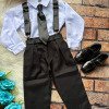 TECIDO: CAMISA BRANCA MANGA Longa MICROFIBRA 100% POLIESTER TECIDO DA CALÇA TWILL COLORIDO 100% POLIESTER SUSPENSORIO EM CETIM 100% POLIESTERNOIVINHOCASAMENTOPAJEMBATIZADO Conjunto composto por: Camisa social branca na cor, gravata, cinto e calça com suspensório na cor preta. Demais peças ou acessórios, não inclusos. * LEMBRANDO QUE PODERA HAVER VARIAÇÃO DE TONALIDADE DO PRODUTO DEPENDENDO DA TELA DO SEU DISPOSITIVO