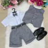 TECIDO: CAMISA BRANCA MICROFIBRA 100% POLIESTERTECIDO DO SHORTS TWILL COLORIDO 100% POLIESTER Conjunto composto por: Camisa social na cor Branca, gravata borboleta CINZA shorts na cor CINZA, Colete CINZA e Cinto PRETO Demais peças ou acessórios, não inclusos. Calçados Vendindos Separadamente * LEMBRANDO QUE PODERA HAVER VARIAÇÃO DE TONALIDADE DO PRODUTO DEPENDENDO DA TELA DO SEU DISPOSITIVO