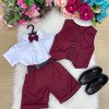 TECIDO: CAMISA BRANCA MICROFIBRA 100% POLIESTERTECIDO DO SHORTS TWILL COLORIDO 100% POLIESTER Conjunto composto por: Camisa social na cor Branca, gravata borboleta MARSALA shorts na cor MARSALA, Colete MARSALA e Cinto PRETO Demais peças ou acessórios, não inclusos. Calçados Vendindos Separadamente * LEMBRANDO QUE PODERA HAVER VARIAÇÃO DE TONALIDADE DO PRODUTO DEPENDENDO DA TELA DO SEU DISPOSITIVO