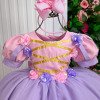 Vestido/Fantasia Infantil Rapunzel Luxo  Um verdadeiro conto de fadas transformado em vestido! Inspirado na doce e sonhadora Princesa Rapunzel, este modelo é perfeito para meninas que amam brilho, cor e encanto. Com saia ampla e armada em camadas de tule lilás cintilante, o vestido cria um efeito leve e mágico a cada movimento. O corpete rosa possui fitas douradas cruzadas e flores de cetim aplicadas nas mangas bufantes e na cintura, trazendo o romantismo e a delicadeza que marcam a princesa dos cabelos dourados. O visual é finalizado com um laço de cabelo rosa com detalhe perolado, combinando perfeitamente com o vestido e garantindo um toque de charme e sofisticação.   Destaques: Modelo inspirado na Princesa Rapunzel Flores de cetim rosa e lilás com acabamento artesanal Fitas douradas cruzadas no corpete Tule lilás com brilho suave e caimento leve Ideal para festas, ensaios fotográficos e aniversários temáticos   Informações Importantes As medidas podem variar em até 2cm. Recomendamos sempre consultar a tabela de medidas antes da compra para evitar erros. Tecido Tecnosport 100% poliester Para um volume extra, indicamos o uso de saiote de armação, vendido separadamente na categoria Acessórios. Tiara e outros acessórios não acompanham o produto, mas estão disponíveis em nosso site. Calçado vendido separadamente, disponível na categoria Calçados As cores do produto podem sofrer variações de tonalidade conforme a configuração da tela do seu dispositivo.