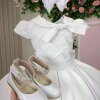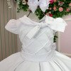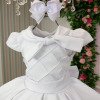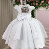 Um verdadeiro encanto! Este vestido Ravena é a escolha perfeita para deixar as pequenas elegantes e radiantes em ocasiões especiais como casamentos, aniversários, formaturas e eventos festivos. Confeccionado em tecido de alfaiataria 100% poliéster, o modelo oferece toque macio, caimento estruturado e aparência sofisticada, mantendo o conforto que as crianças precisam. O busto apresenta um trabalho trançado impecável, que traz textura e requinte à peça. A gola dobrada se une a um laço com detalhe em strass dourado, adicionando um toque delicado e glamouroso. As mangas completam o visual com charme e romantismo. Na parte de trás, o vestido possui abertura em formato arredondado, lastex central para melhor ajuste e um laço grande e estruturado na cintura, tornando o look ainda mais gracioso. A saia é ampla e rodada, com movimento leve e elegante. Detalhes do Produto: Busto trançado com gola e laço decorado com strass Manga curta Abertura nas costas com lastex e laço grande Saia rodada com caimento perfeito Acabamento de alta qualidade Tecido: Alfaiataria 100% poliéster Ideal para:casamentos, daminhas, festas de aniversário, ensaios fotográficos e eventos especiais. Dica: Combine com sapatilhas douradas, pratas ou brancas para um visual completo e encantador. Informações Importantes As medidas podem variar em até 2cm. Recomendamos sempre consultar a tabela de medidas antes da compra para evitar erros. Tecido 100% poliester Para um volume extra, indicamos o uso de saiote de armação, vendido separadamente na categoria Acessórios. Tiara e outros acessórios não acompanham o produto, mas estão disponíveis em nosso site. Calçado vendido separadamente, disponível na categoria Calçados As cores do produto podem sofrer variações de tonalidade conforme a configuração da tela do seu dispositivo.