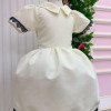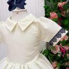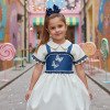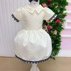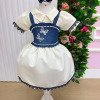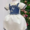 Um look encantador que combina a delicadeza do vestido com a modernidade do jeans! O vestido em tecido off possui gola clássica e mangas curtas com detalhe em renda azul marinho, trazendo um toque sofisticado. Sobreposto, o colete jeans dá um ar moderno e cheio de estilo, decorado com aplicações de borboletas e detalhes em pérolas que tornam a peça ainda mais especial. Destaques do modelo: Vestido off com gola e mangas delicadas Mangas com acabamento em renda azul marinho Colete jeans aplicado, com lastex nas costas para melhor ajuste Detalhes em pérolas e borboletas aplicadas no busto Saia levemente rodada, confortável para brincar e encantar   Ideal para passeios, festas e momentos especiais, esse conjunto une charme e conforto em uma só peça.   Informações Importantes As medidas podem variar em até 2cm. Recomendamos sempre consultar a tabela de medidas antes da compra para evitar erros. Tecido 100% poliester Para um volume extra, indicamos o uso de saiote de armação, vendido separadamente na categoria Acessórios. Tiara e outros acessórios não acompanham o produto, mas estão disponíveis em nosso site. Calçado vendido separadamente, disponível na categoria Calçados As cores do produto podem sofrer variações de tonalidade conforme a configuração da tela do seu dispositivo.