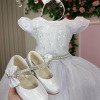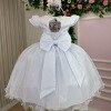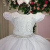 Confeccionado em tecido misto possui forro em poliéster e algodão para não incomodar a criança e proporcionando um caimento incrível e sofisticado, possui gola redonda, comprimento médio, mangas curtas, possui elástico nas costas para melhor ajuste, acabamento com lindo laço na parte posterior do vestido completa o look dos sonhos! BRANCO, TULE, FLORZINHA. * Medidas podem variar em até 4cm * Caso queira o vestido mais armado, recomendamos o uso do saiote ou anágua de armação, disponível no nosso site na categoria acessórios. * Tiara vendida separadamente, disponível em nosso site na categoria acessórios.